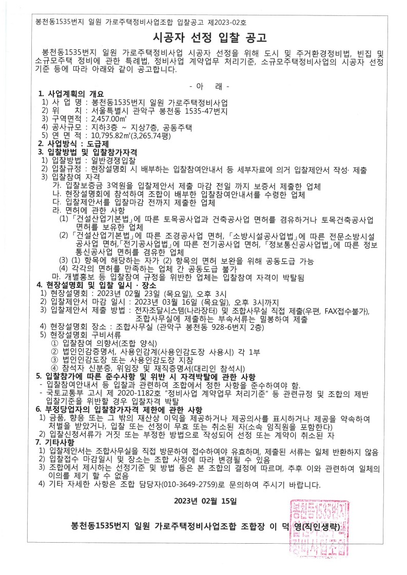 추진위원회/조합명 : 봉천동 1535번지 일원 가로주택정비사업
