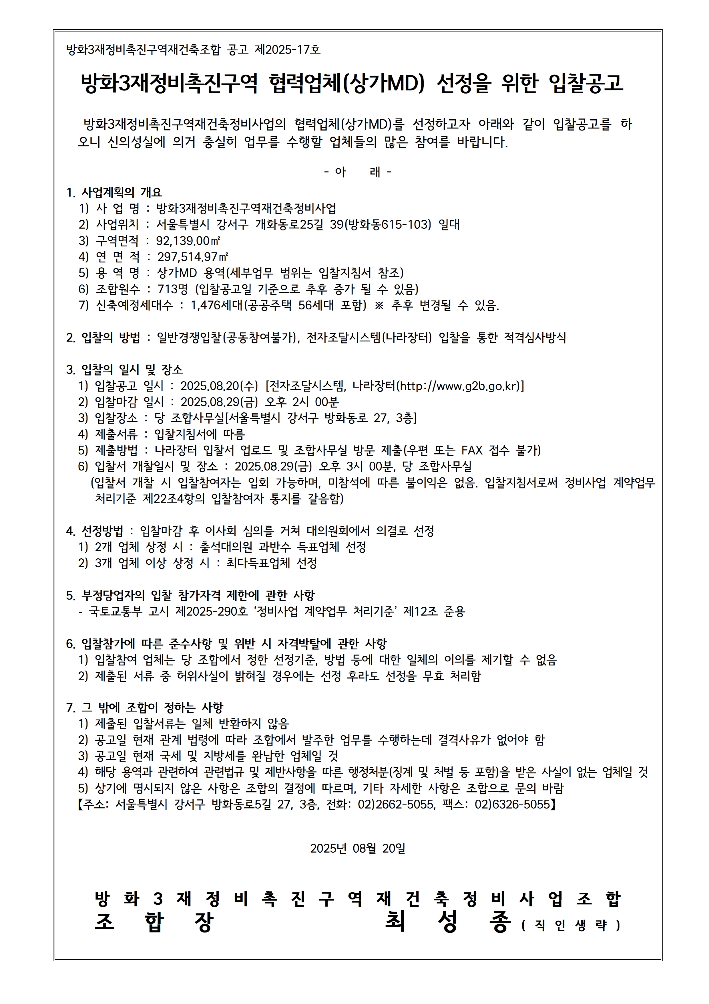 추진위원회/조합명 : 방화3재정비촉진구역 재건축정비사업조합