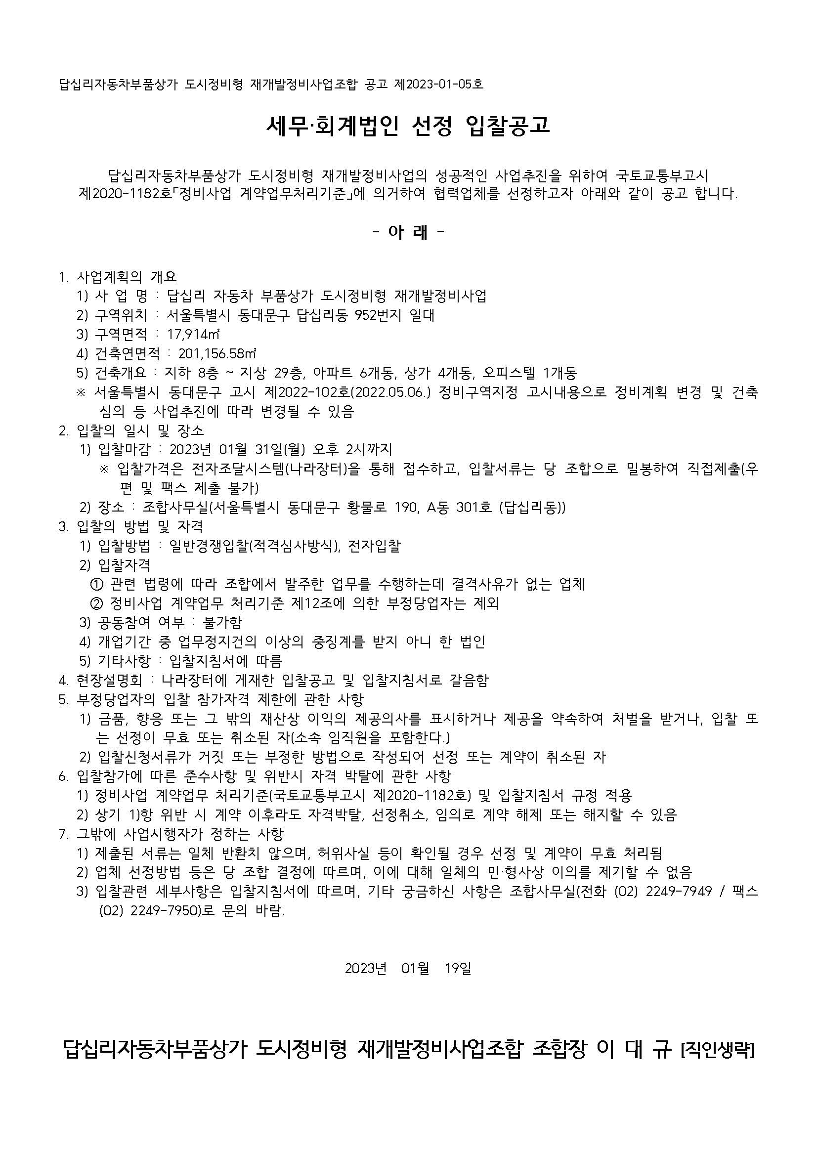 답십리자동차부품상가 도시정비형 재개발정비사업 세무·회계 업체 입찰공고