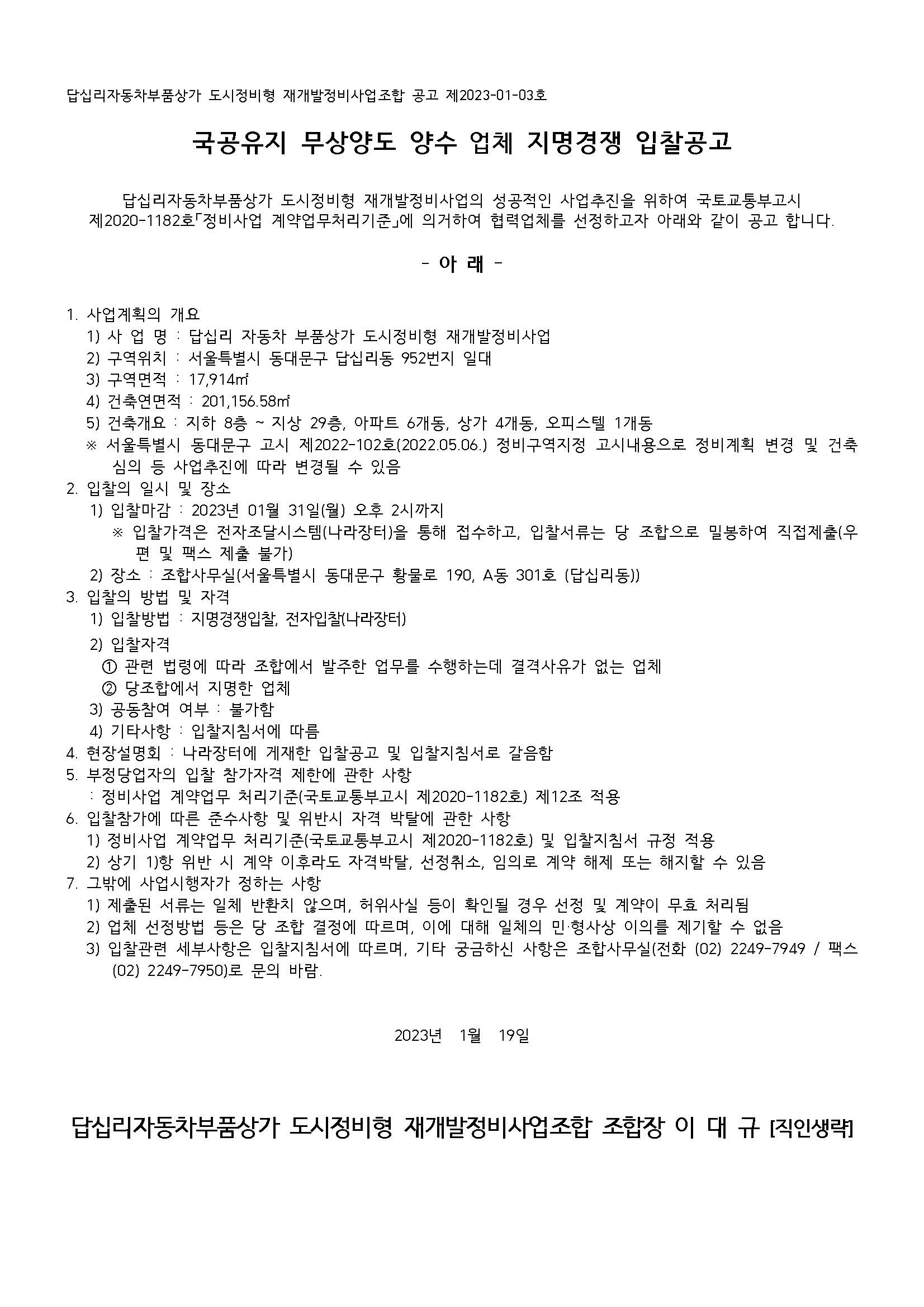 입찰명 : 답십리자동차부품상가 도시정비형 재개발정비사업 국공유지 무상양도 양수 업체 지명경쟁 입찰공고