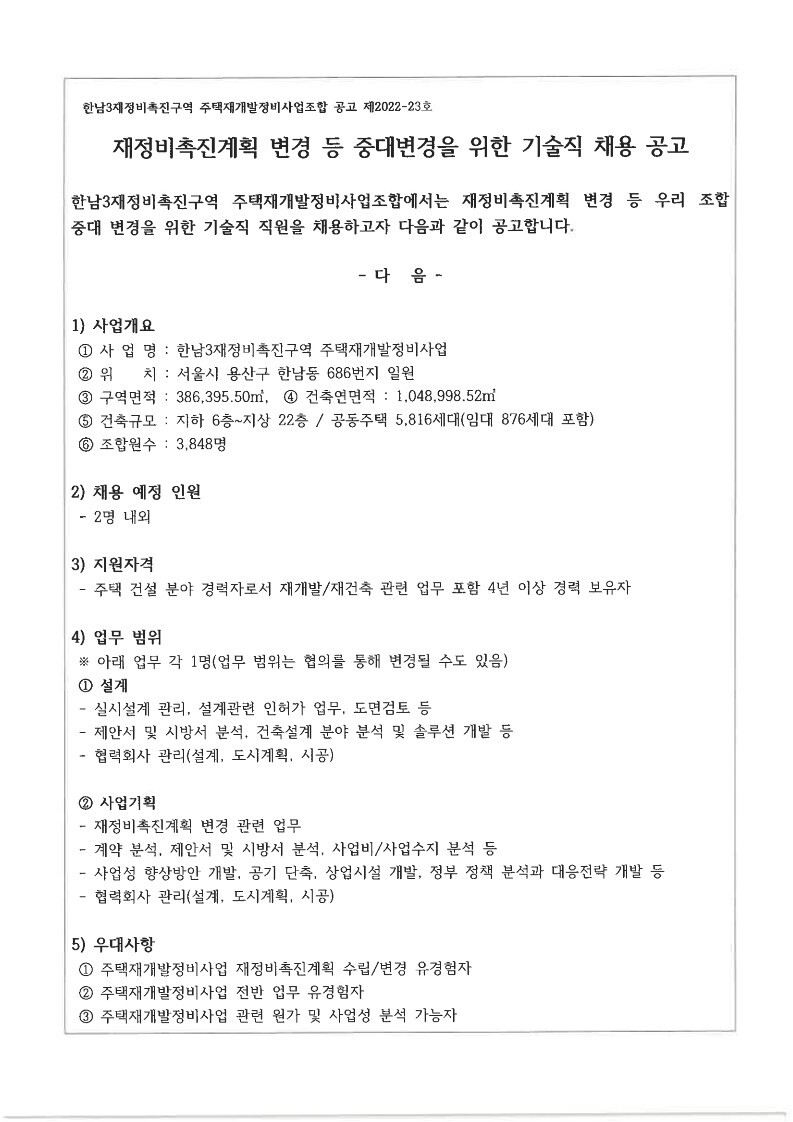 입찰명 : 재정비촉진계획 변경 등 중대변경을 위한 기술직 채용 공고(2차)