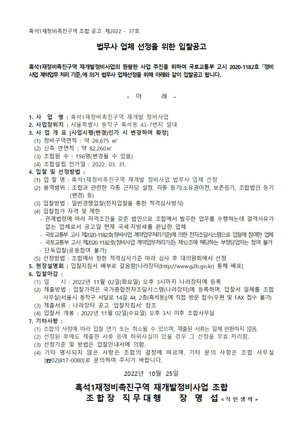 입찰명 : 흑석1재정비촉진구역 재개발정비사업 법무사 업체 선정