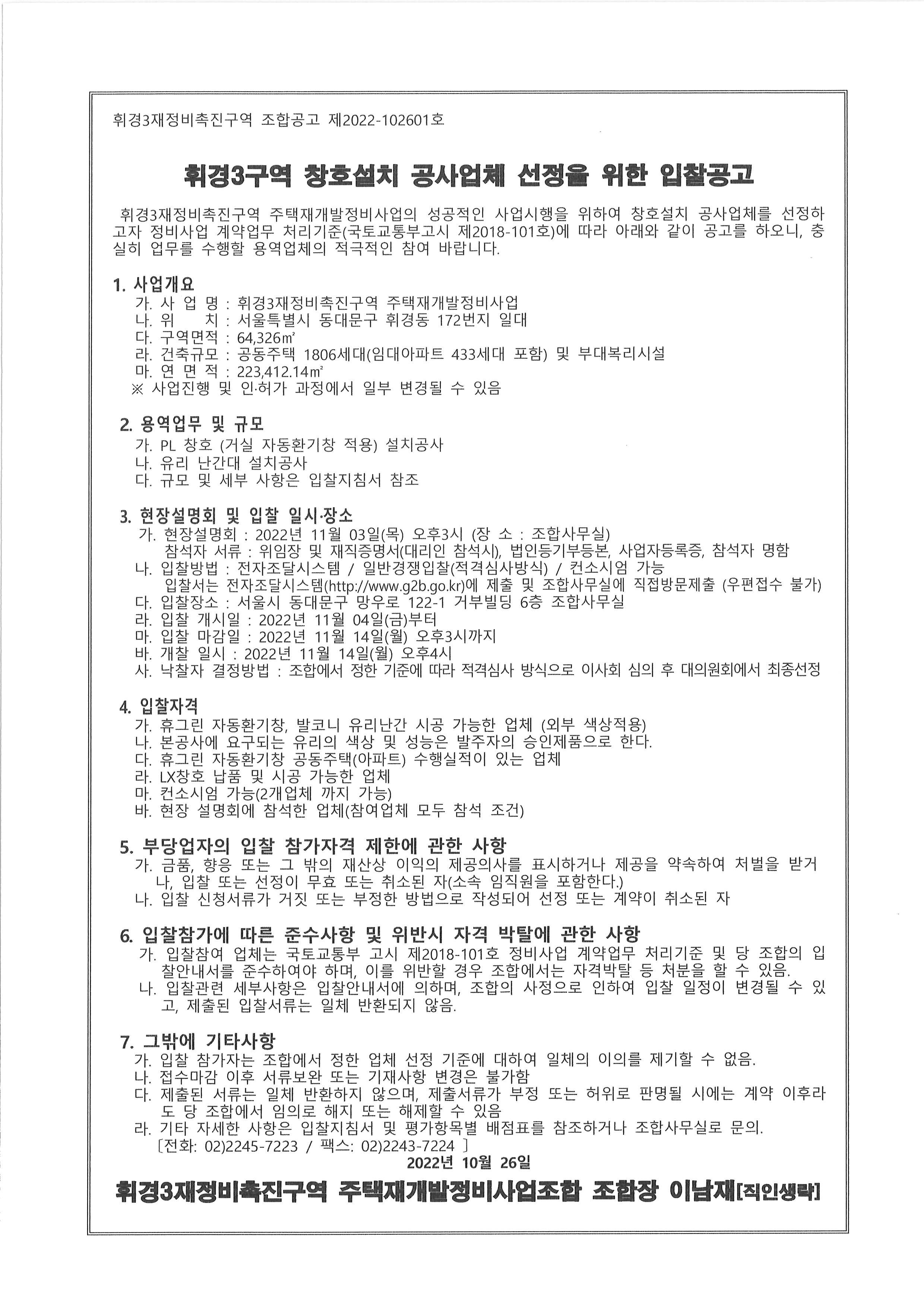 휘경3구역 창호설치 공사업체 선정을 위한 입찰공고