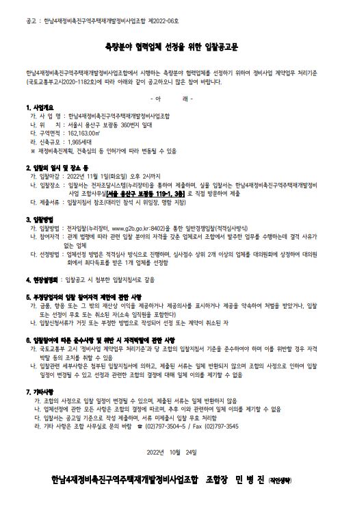 한남4재정비촉진구역 지적측량 협력업체 선정을 위한 입찰공고문
