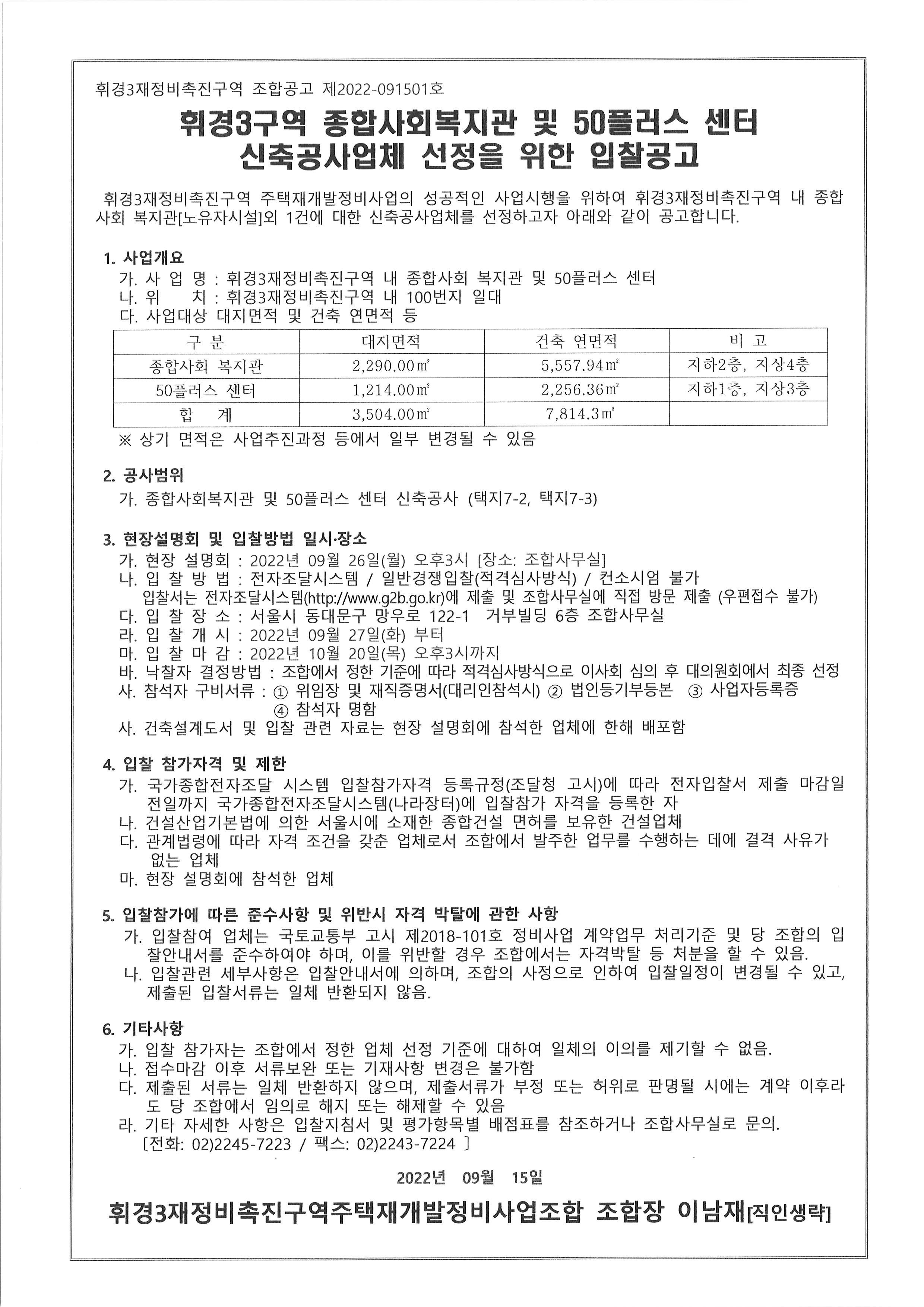 입찰명 : 휘경3구역 종합사회복지관 및 50플러스센터 신축공사업체 선정을 위한 입찰공고