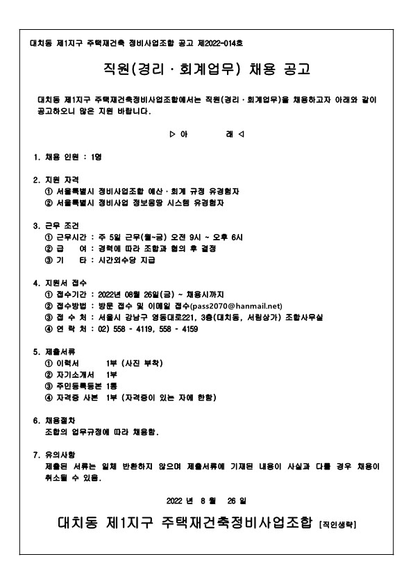 입찰명 : 대치1지구 재건축정비사업조합 경리회계 직원 모집