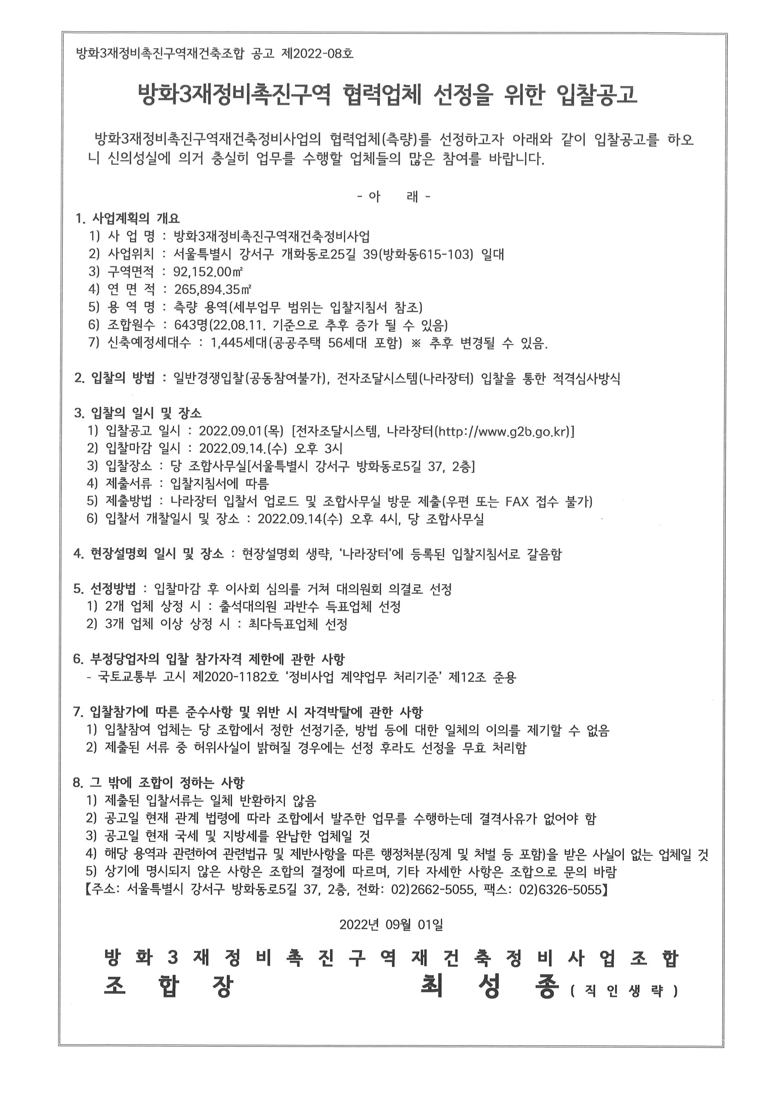 입찰명 : 방화3재정비촉진구역재건축정비사업 협력업체(측량) 선정 공고