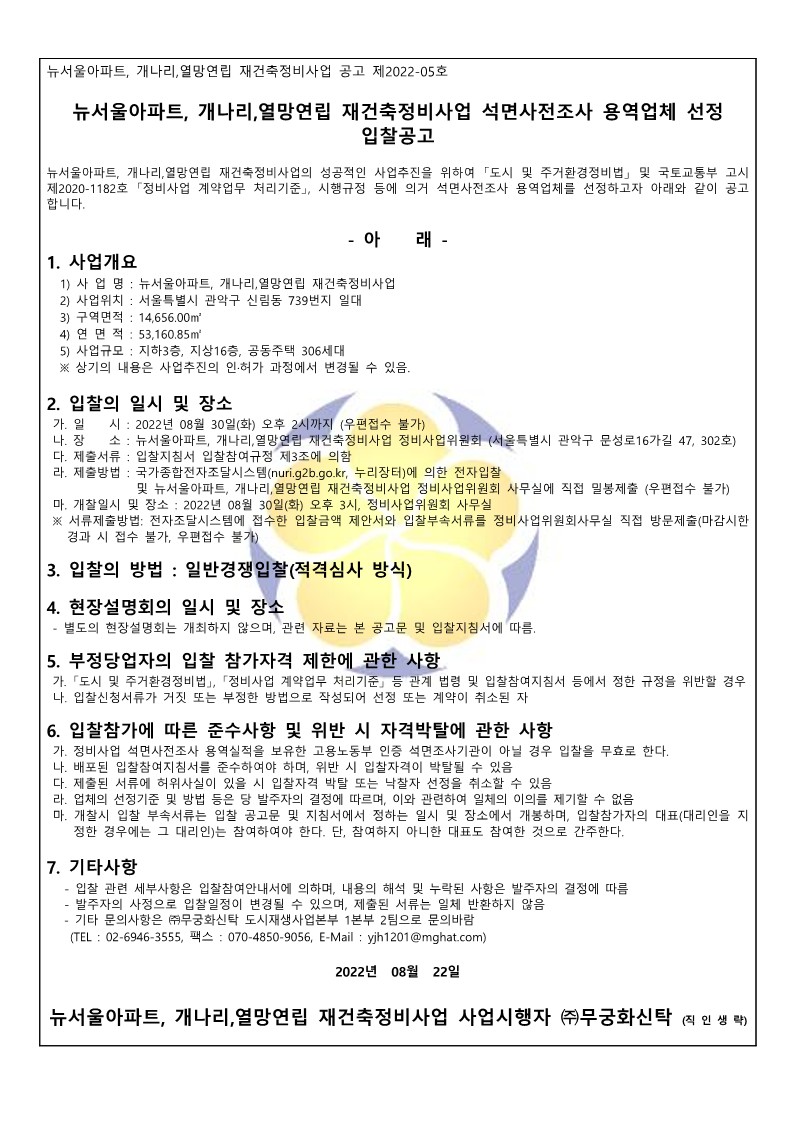 [석면사전조사 용역업체 선정 입찰공고]제2022-05호