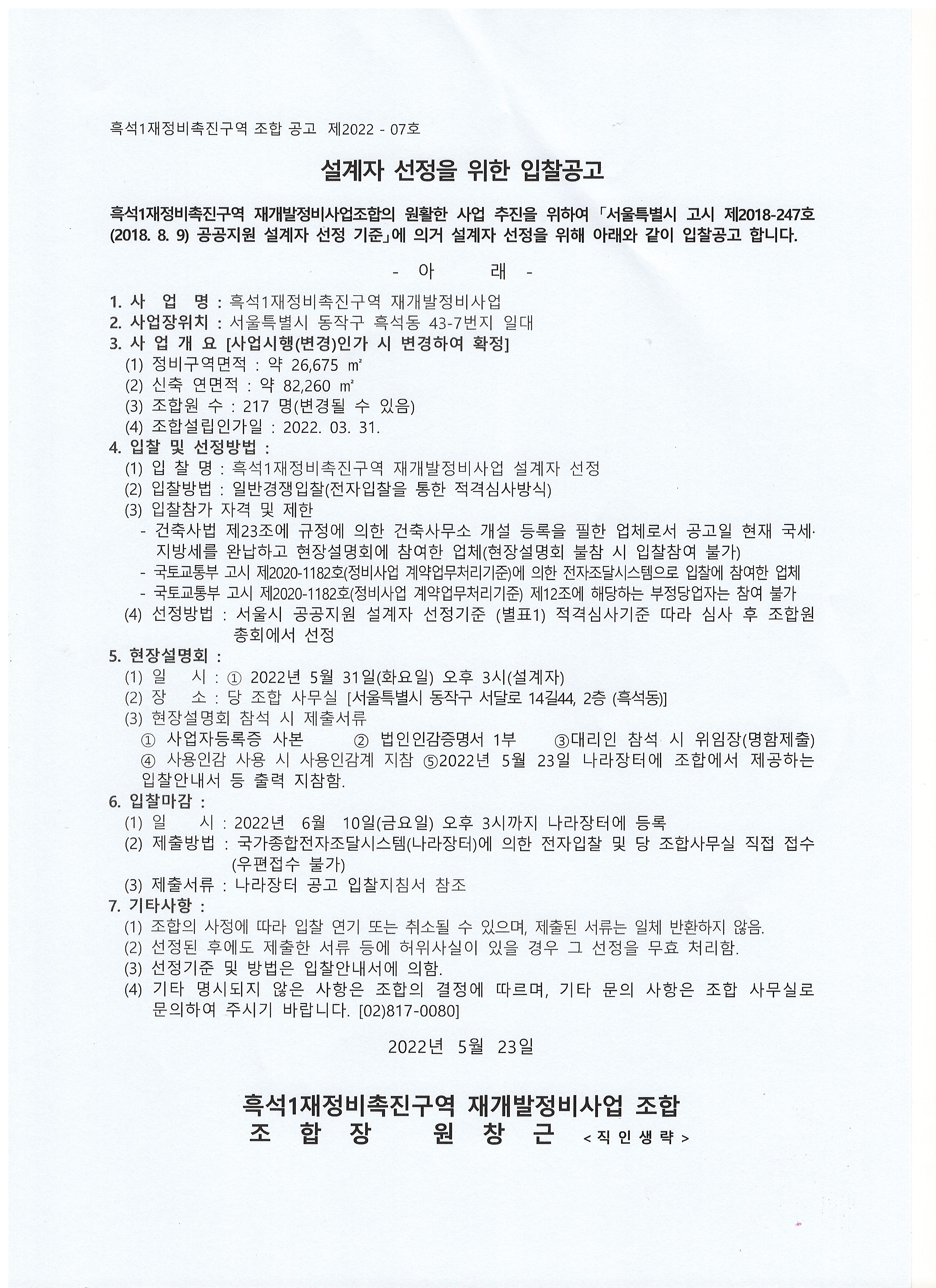 추진위원회/조합명 : 흑석1재정비촉진구역 재개발정비사업조합