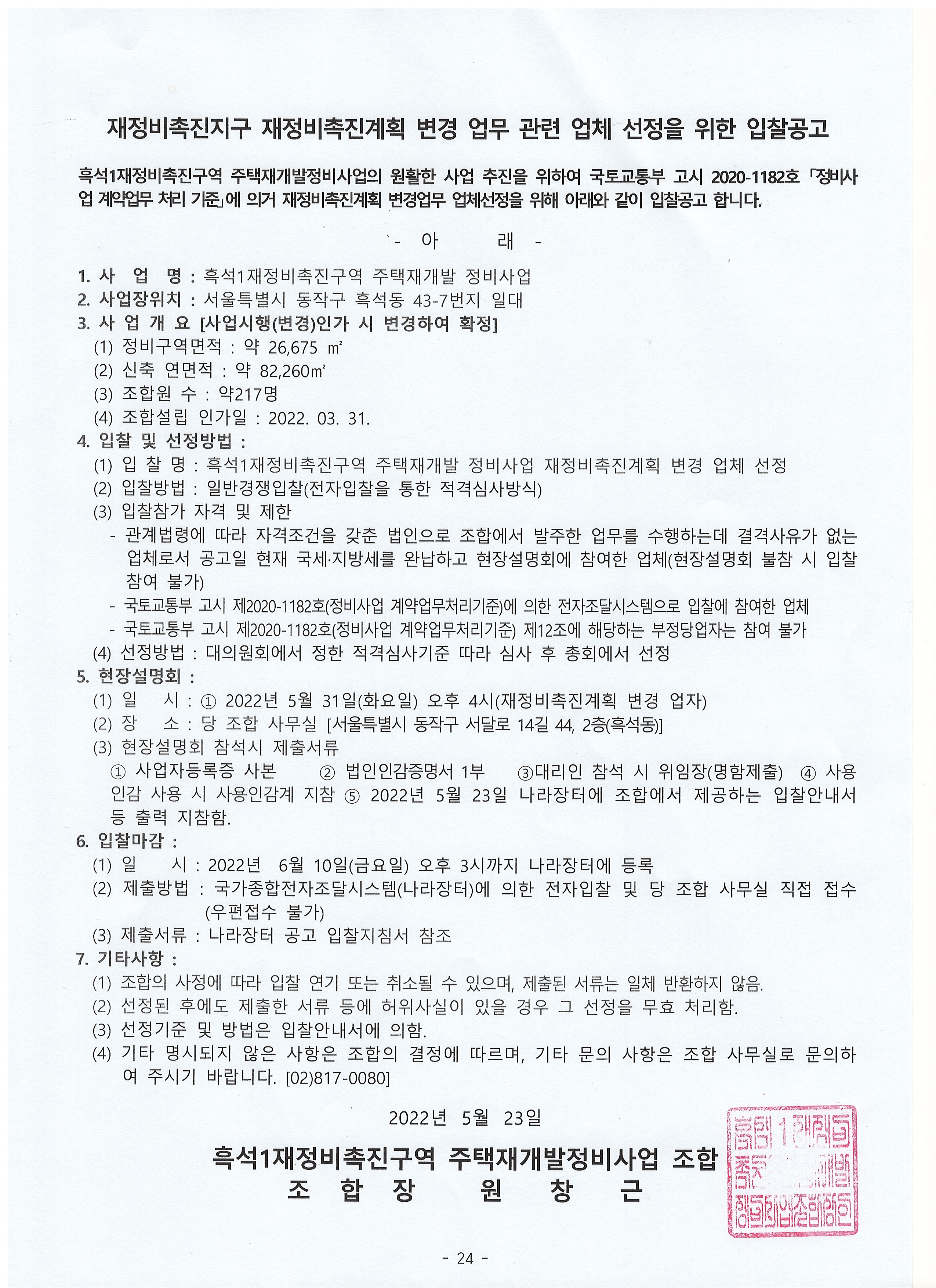 입찰명 : 흑석1재정비촉진구역 주택재개발 정비사업 재정비촉진계획 변경 업체 선정