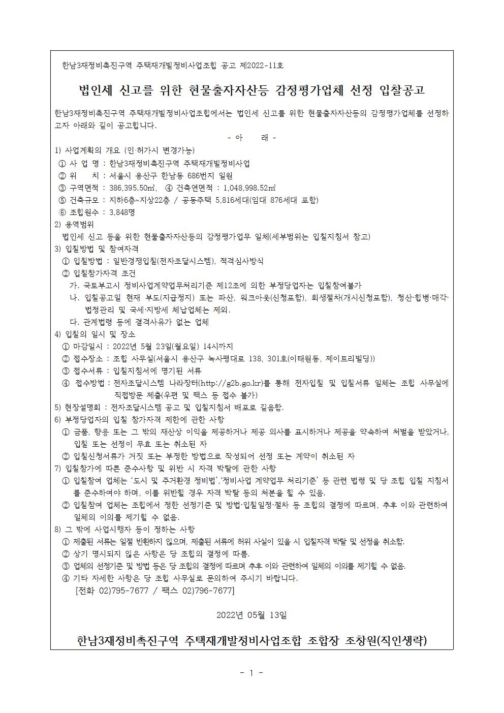 입찰명 : 법인세 신고를 위한 현물출자자산등 감정평가업체 선정 입찰공고