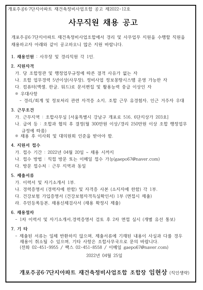 사무직원(사무장, 실장) 채용 공고