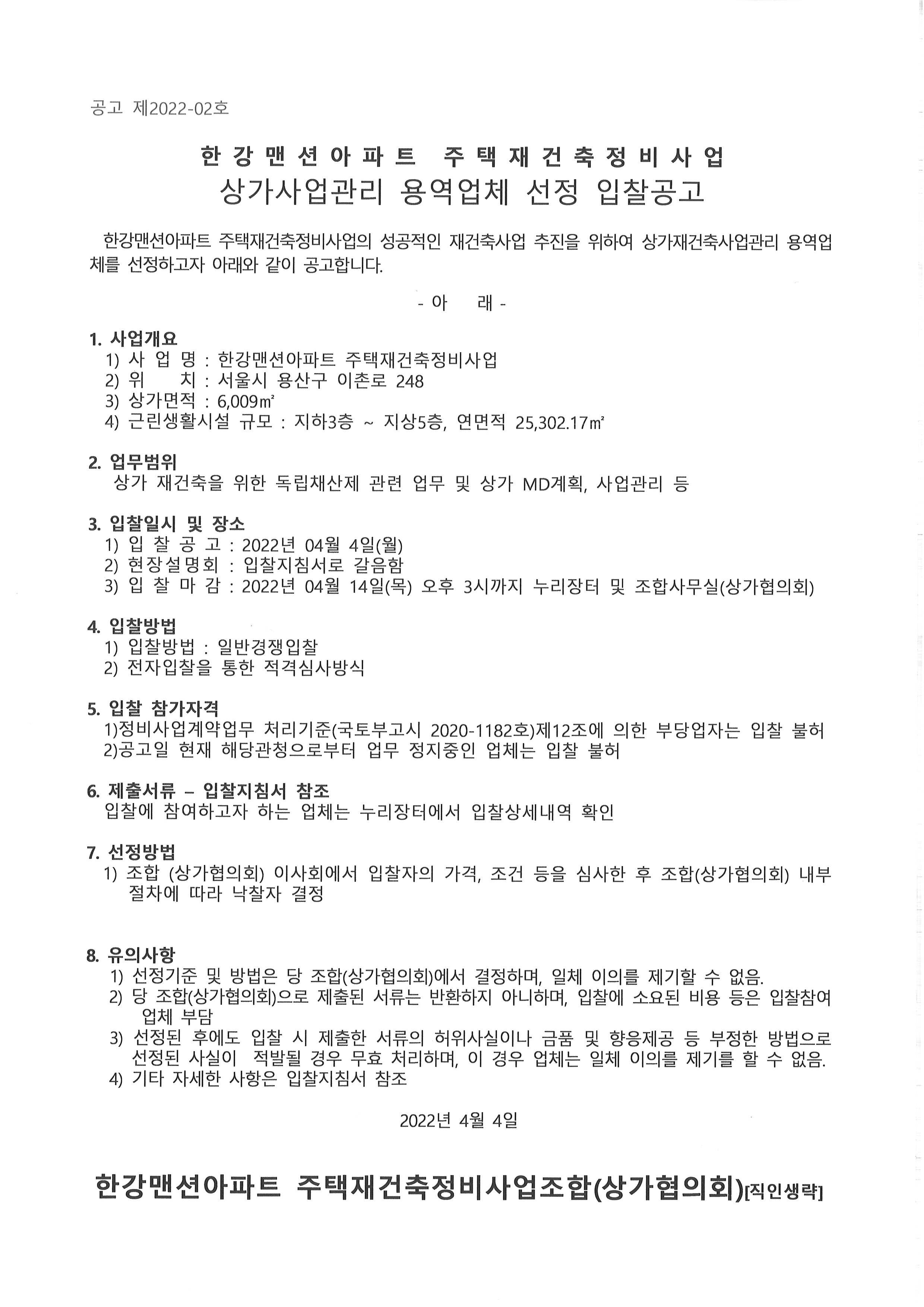 한강맨션아파트 주택재건축정비사업조합(상가협의회)상가사업관리 용역업체 선정 입찰공고