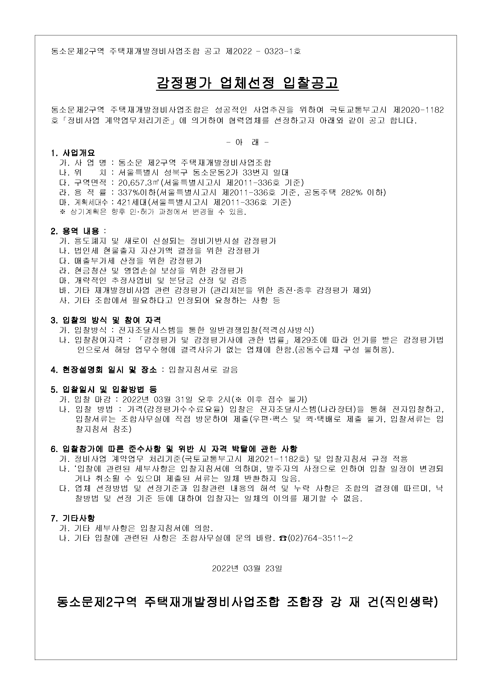 동소문제2구역 감정평가업체 선정을 위한 입찰공고