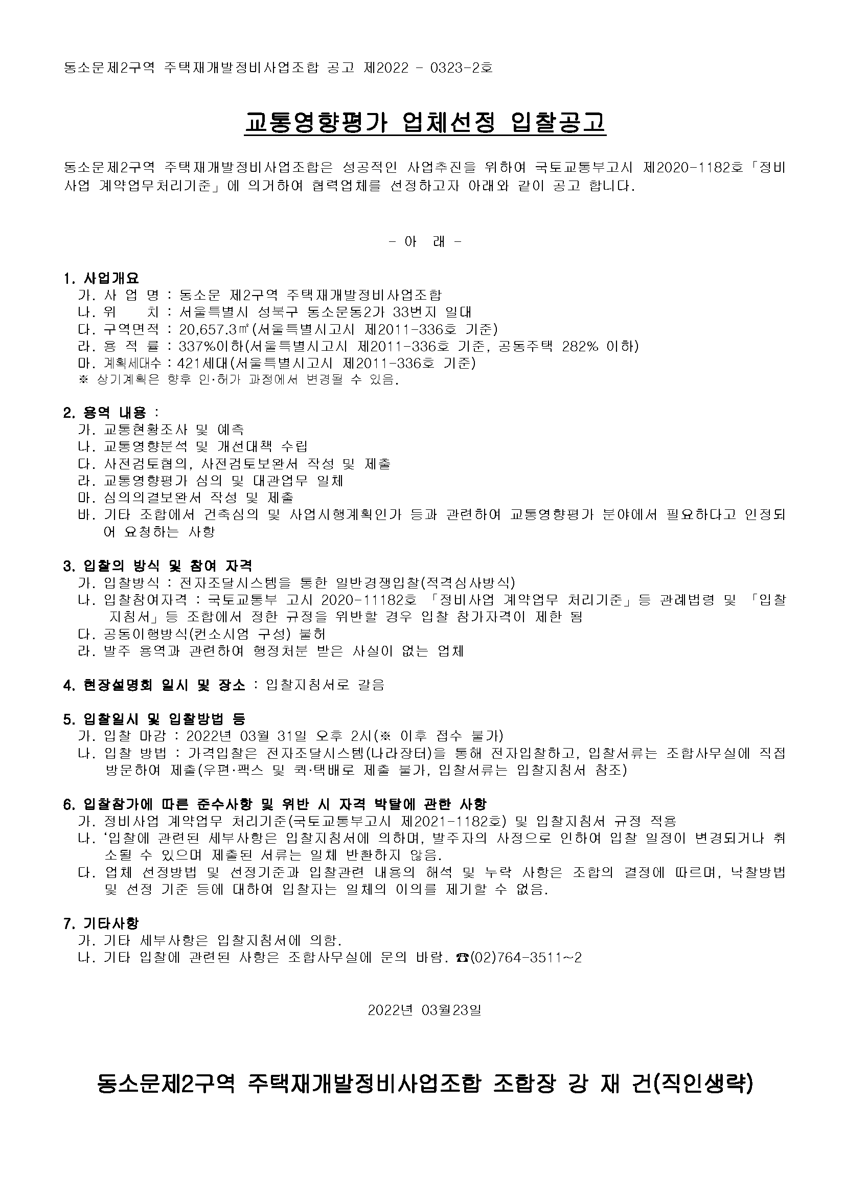 동소문2구역 교통영향평가 업체선정을 위한 입찰 공고