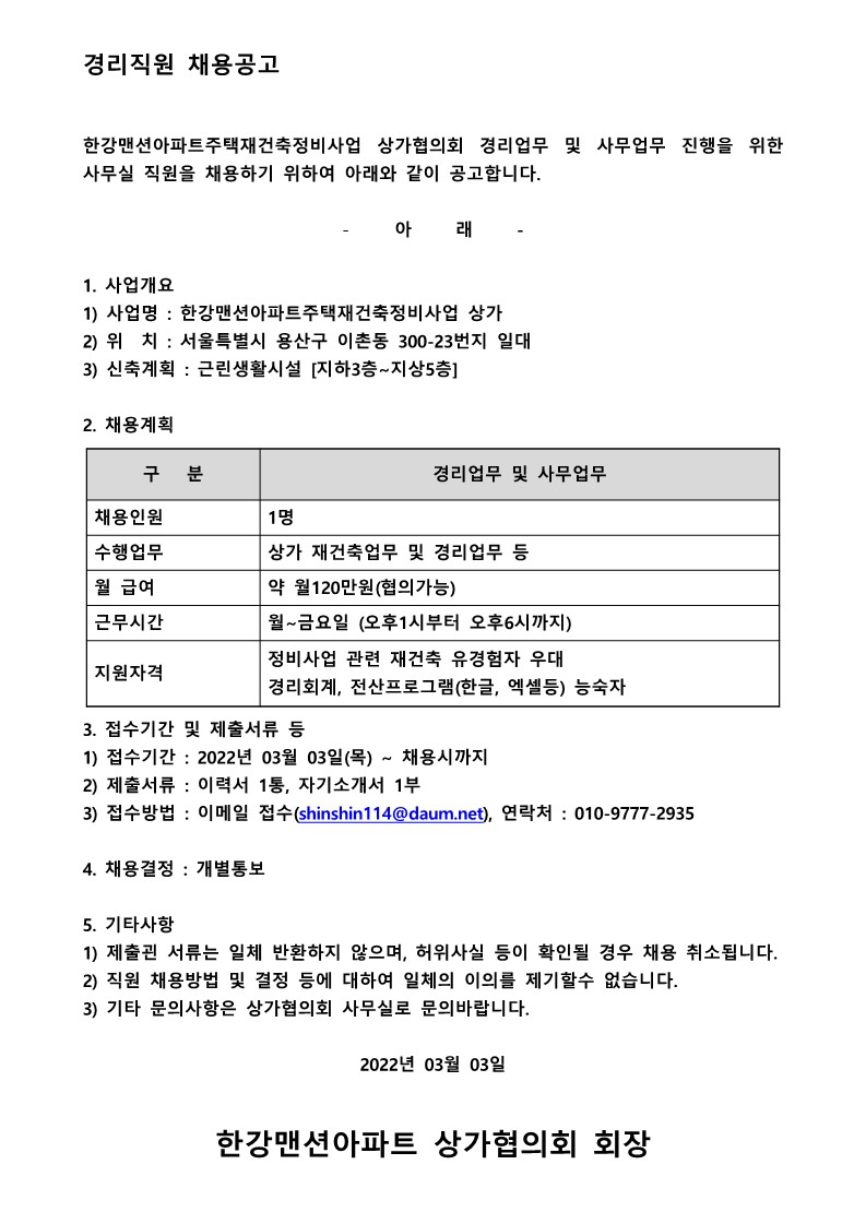 한강맨션아파트 상가협의회 경리직원 채용공고