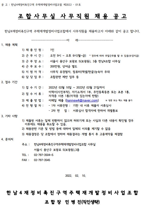 입찰명 : 한남4조합사무실 사무직원 채용 공고