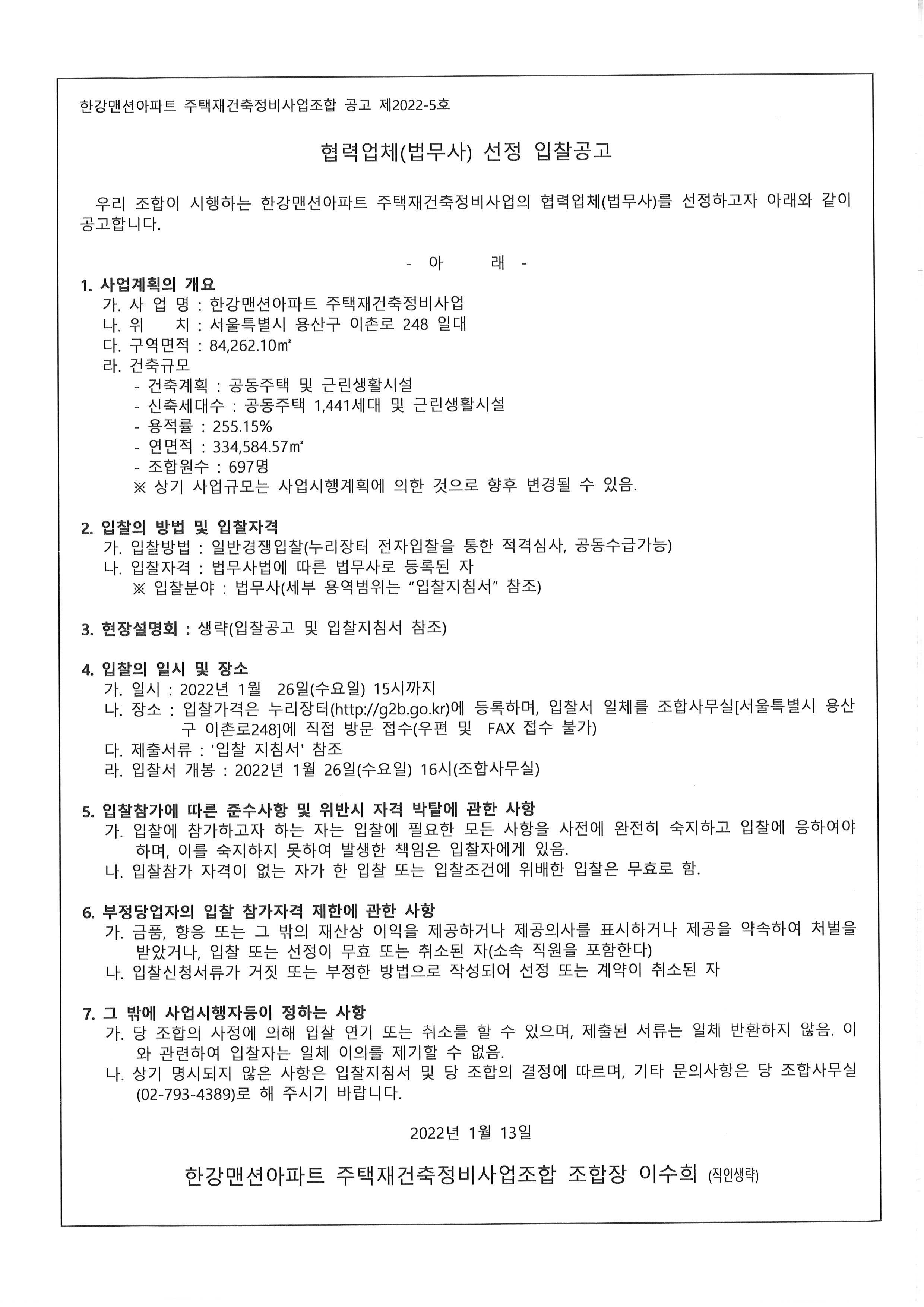 추진위원회/조합명 : 한강맨션아파트 주택재건축 조합