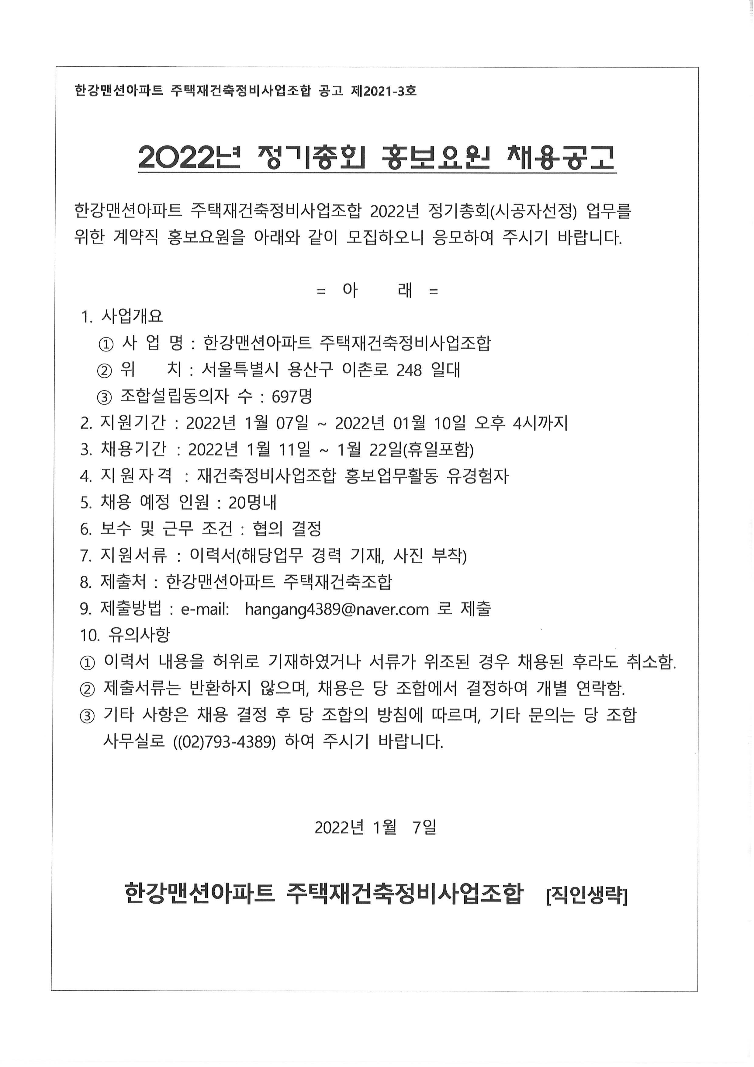 입찰명 : 정기총회(시공자선정)업무 계약직 홍보요원 채용공고
