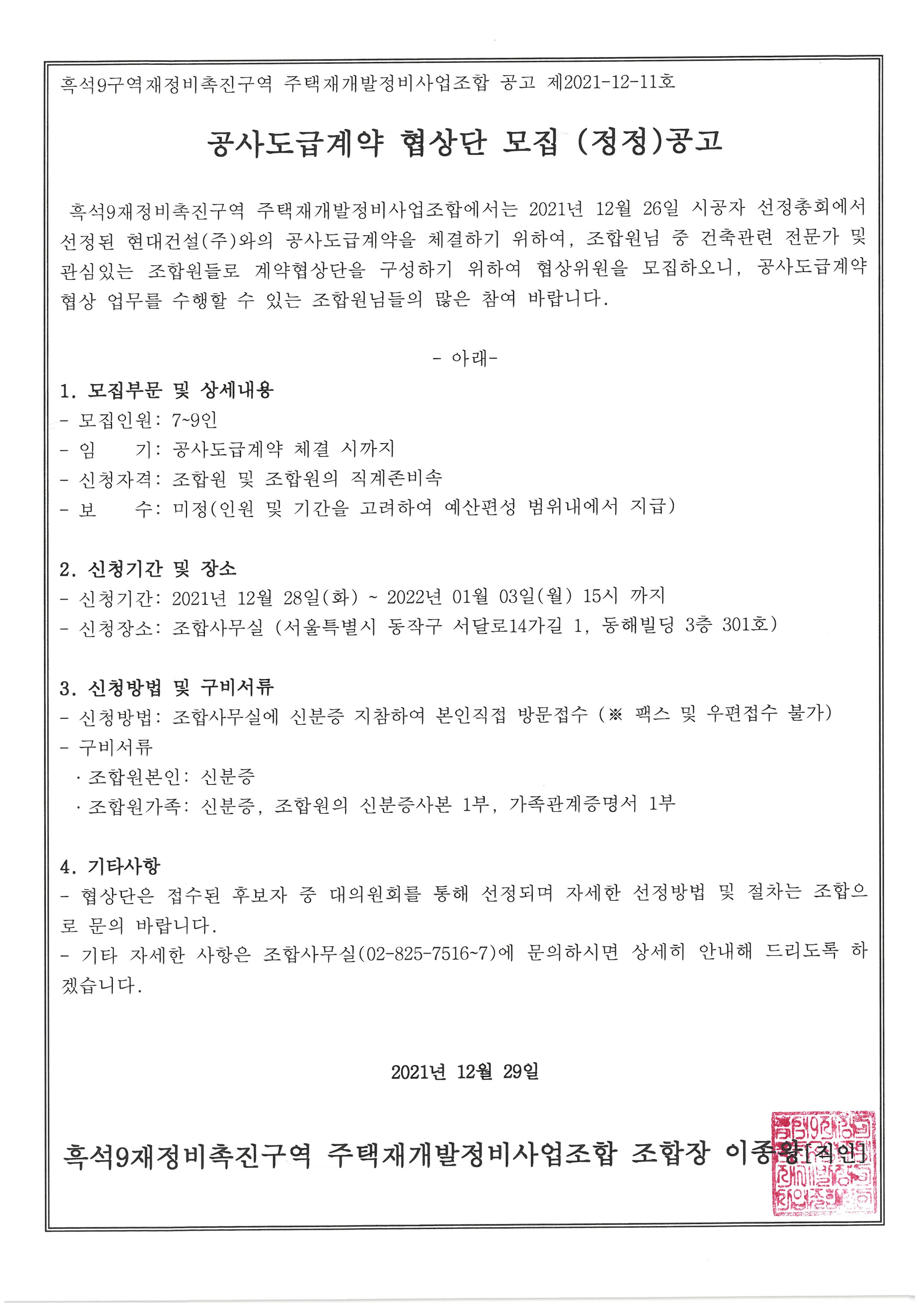 입찰명 : 공사도급계약 협상단 모집(정정)공고