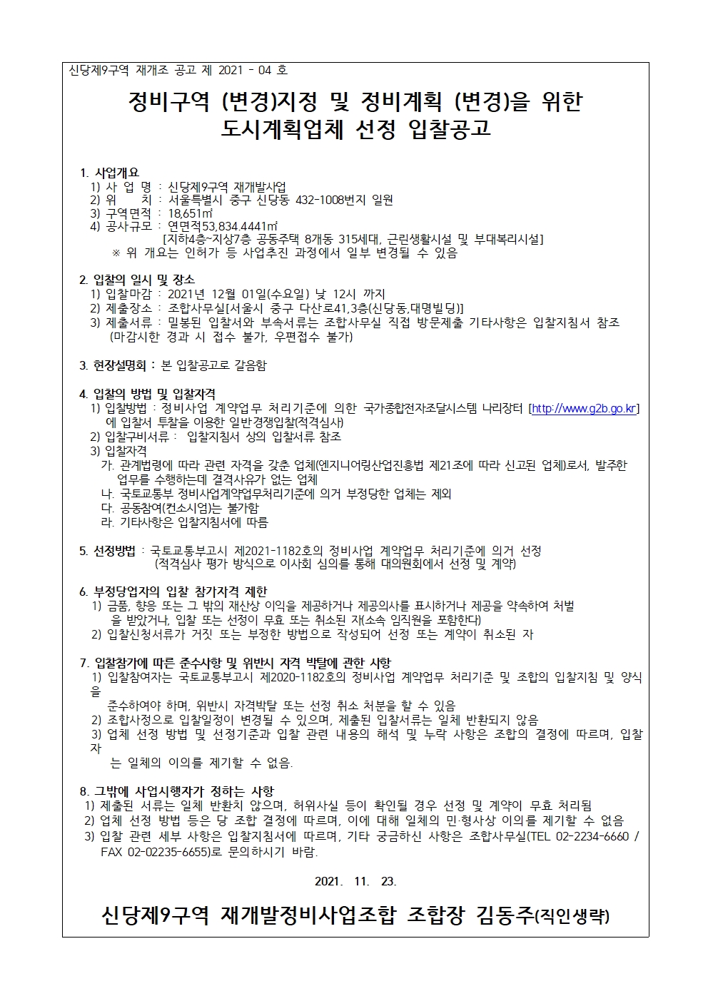 신당9구역 정비구역(변경)지정 및 정비계획(변경)을 위한 도시계획업체 입찰공고