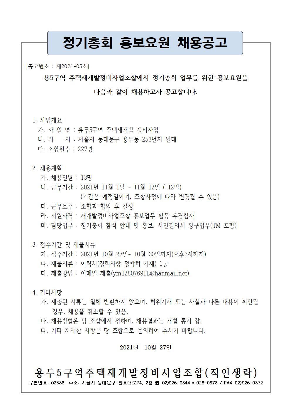 [공고 제2021-05호] 정기총회 홍보요원 채용공고
