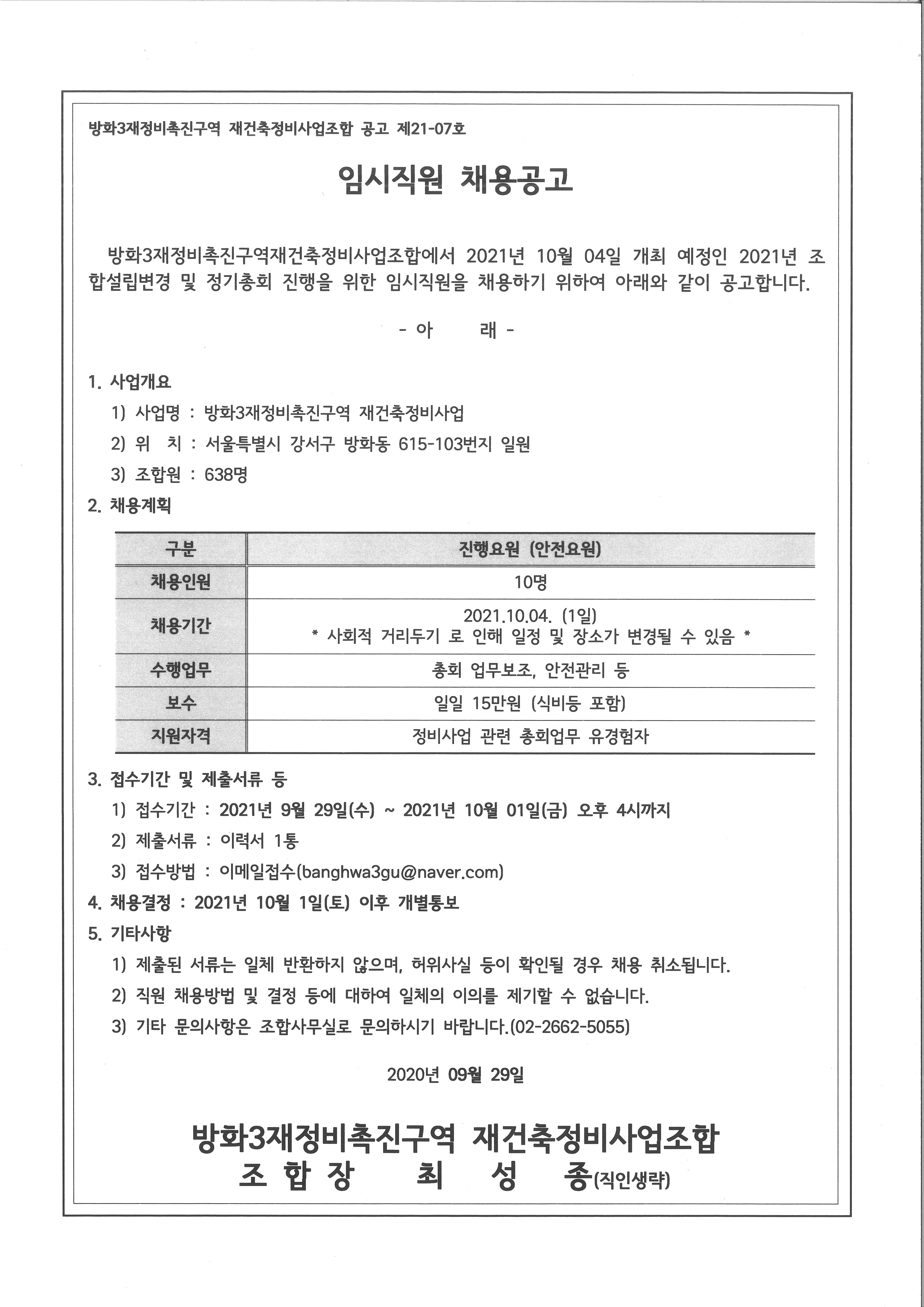 추진위원회/조합명 : 방화3재정비촉진구역 재건축정비사업조합