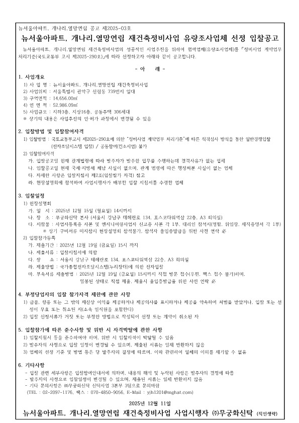 뉴서울아파트, 개나리,열망연립 재건축정비사업 유량조사업체 선정 입찰공고