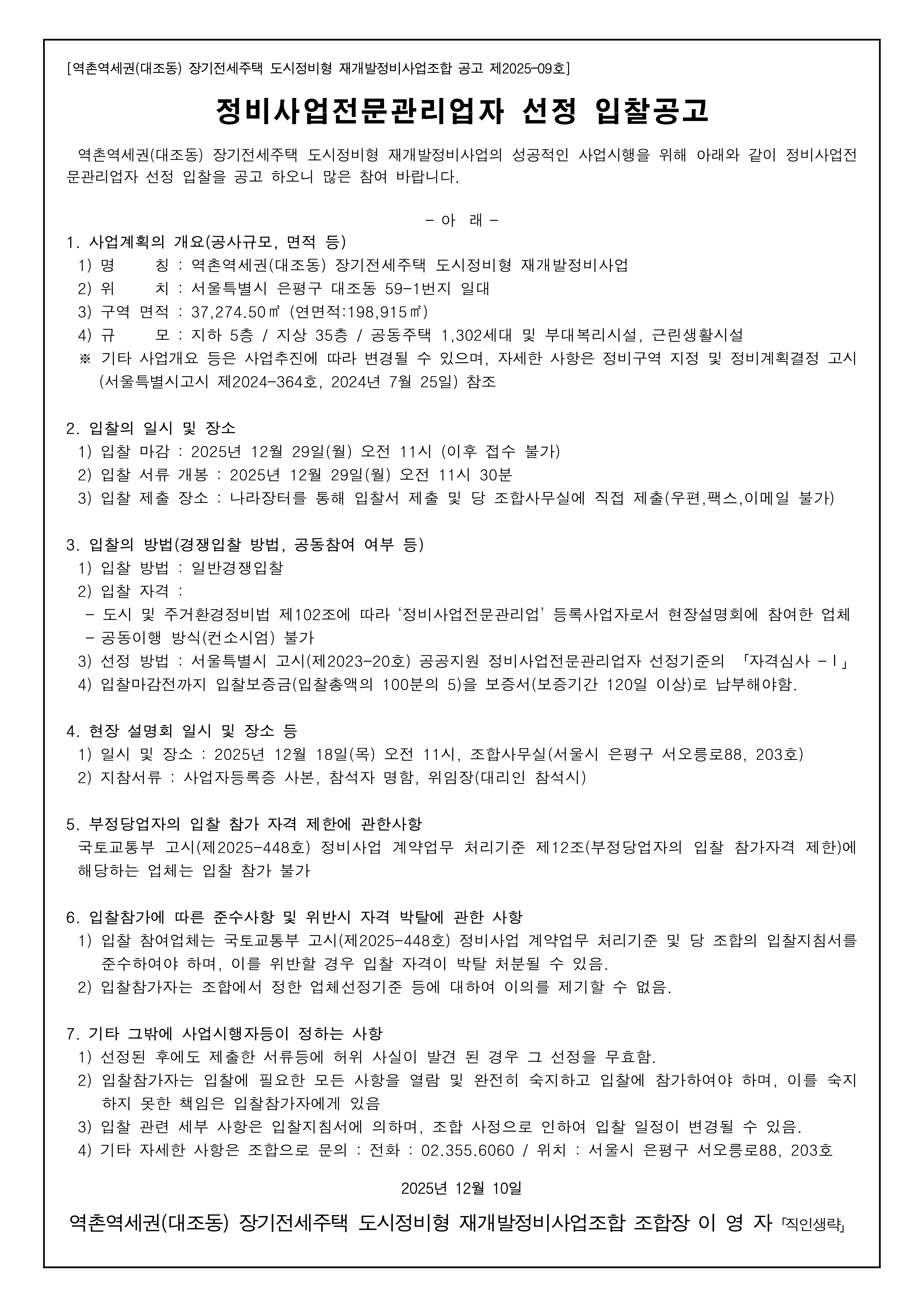 입찰명 : 정비사업전문관리업자 선정 입찰공고