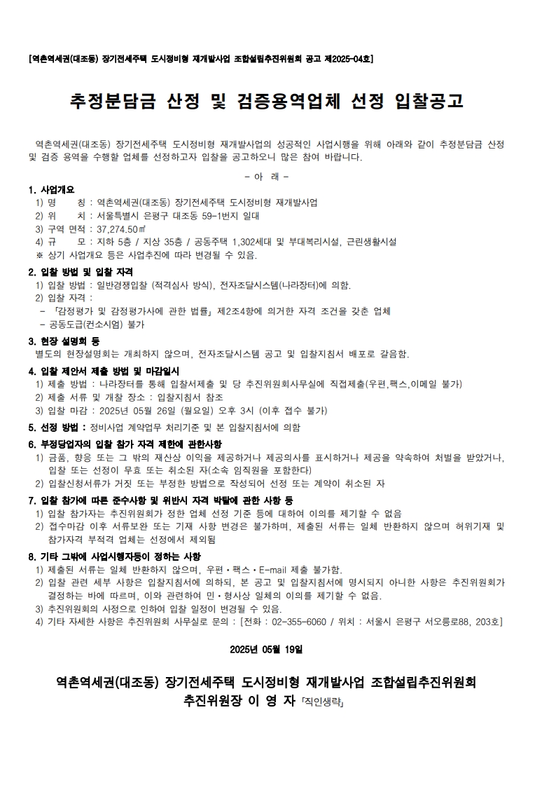 추정분담금 산정 및 검증 용역업체 선정 입찰 공고