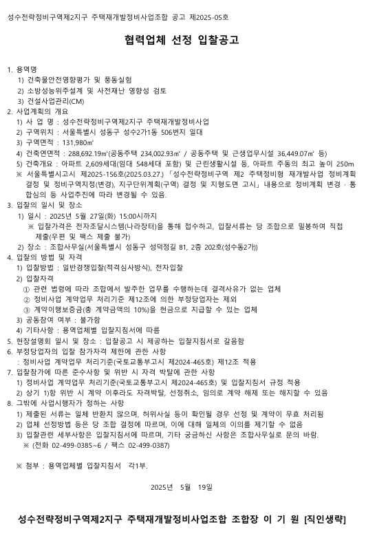 입찰명 : 성수2 안전영향평가(풍동실험 포함) 협력업체 입찰공고
