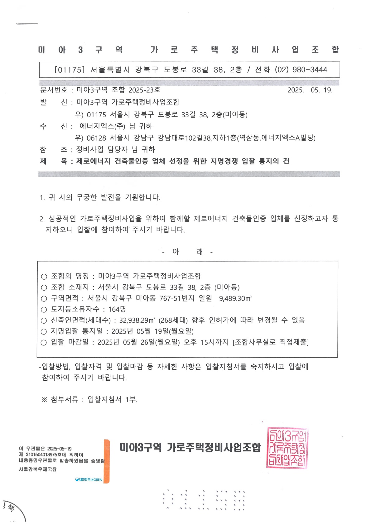 제로에너지 건축물인증 업체 선정을 위한 지명경쟁 입찰 통지의 건