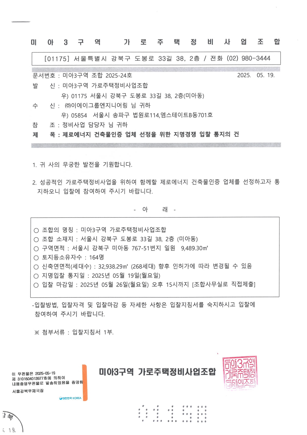 제로에너지 건축물인증 업체 선정을 위한 지명경쟁 입찰 통지의 건