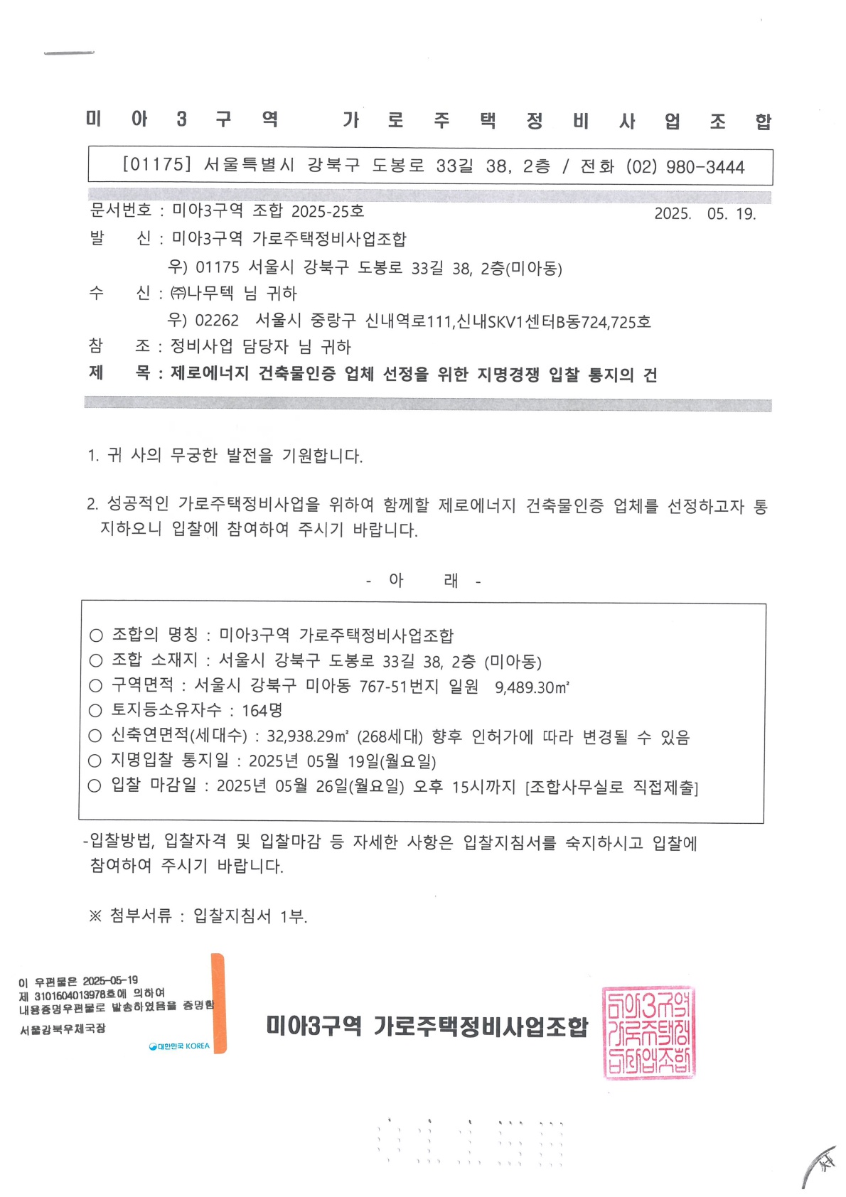 제로에너지 건축물인증 업체 선정을 위한 지명경쟁 입찰 통지의 건