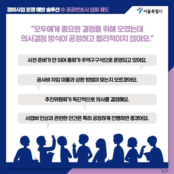 조합원에게 경제적 부담이 따르는 계약을 사전 총회 의결 없이 대의원회에서 선정하고 사후 총회에서 추인하는 등 실제 조합원 다수의 의견이 반영되지 않은 절차상 부적정한 사례가 다수 있었습니다. 공공변호사 입회 제도를 통해 조합의 의사결정 과정이 공정하게 이뤄지도록 돕는다면 갈등 예방에 효과적일 겁니다.